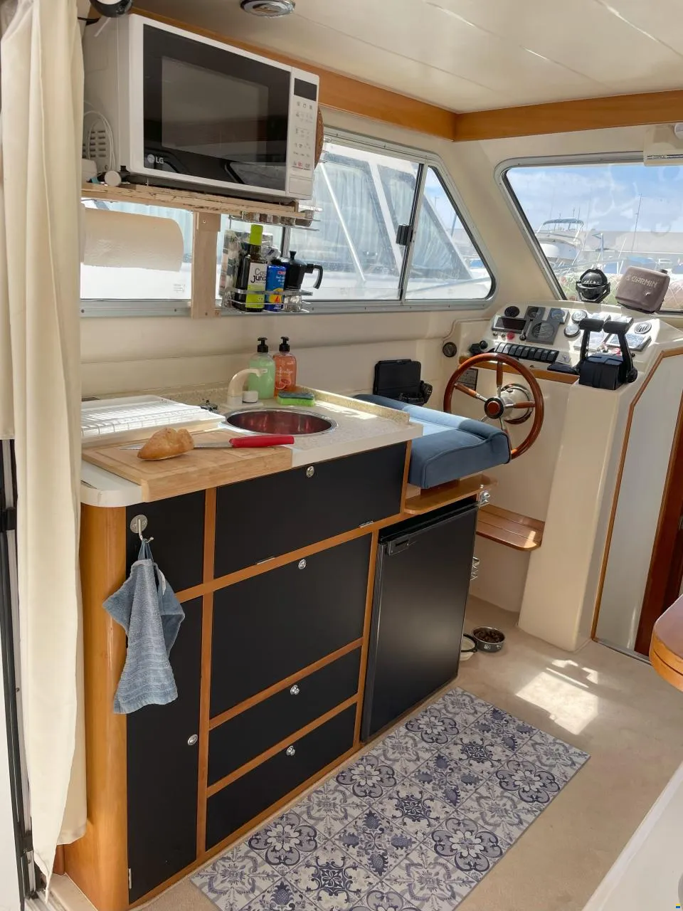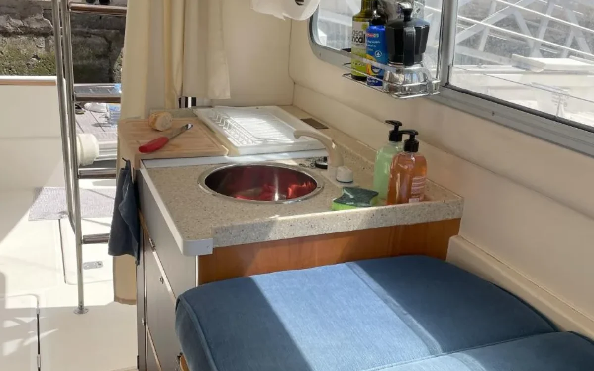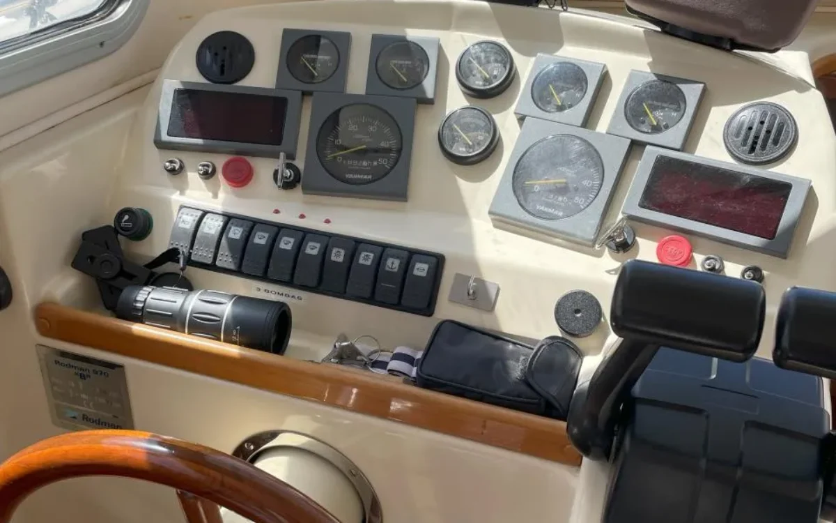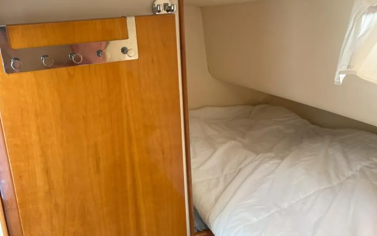 Sale a la venta un estupendo yate con 2 motores Yanmar de 240CV, pese a su contenida eslora de 9,70m ofrece todo lo necesario; salón con sofas, mesa plegable y cocina completa (frigorífico, microondas, placa eléctrica, fregadero y amplios espacios de almacenaje), un confortable camarote principal y otro adicional con 2 literas, baño con ducha, una amplia bañera en popa donde se puede ubicar una mesa o usarla para pescar, plataforma de baño con escalera, colchonetas en proa y un flybridge con toldo.